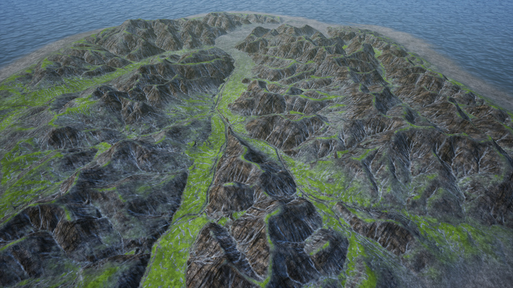 Each two kilometer landscape can be scaled up to 200% to give a four kilometer island with very little loss in visual quality.